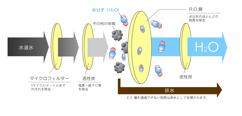 R.O.浄水器は、水分子のみを通過させるR.O.膜に、活性炭とマイクロフィルターを組み合わせることにより、水道水に含まれるほとんどの物質を、ほぼ完全に除去します。